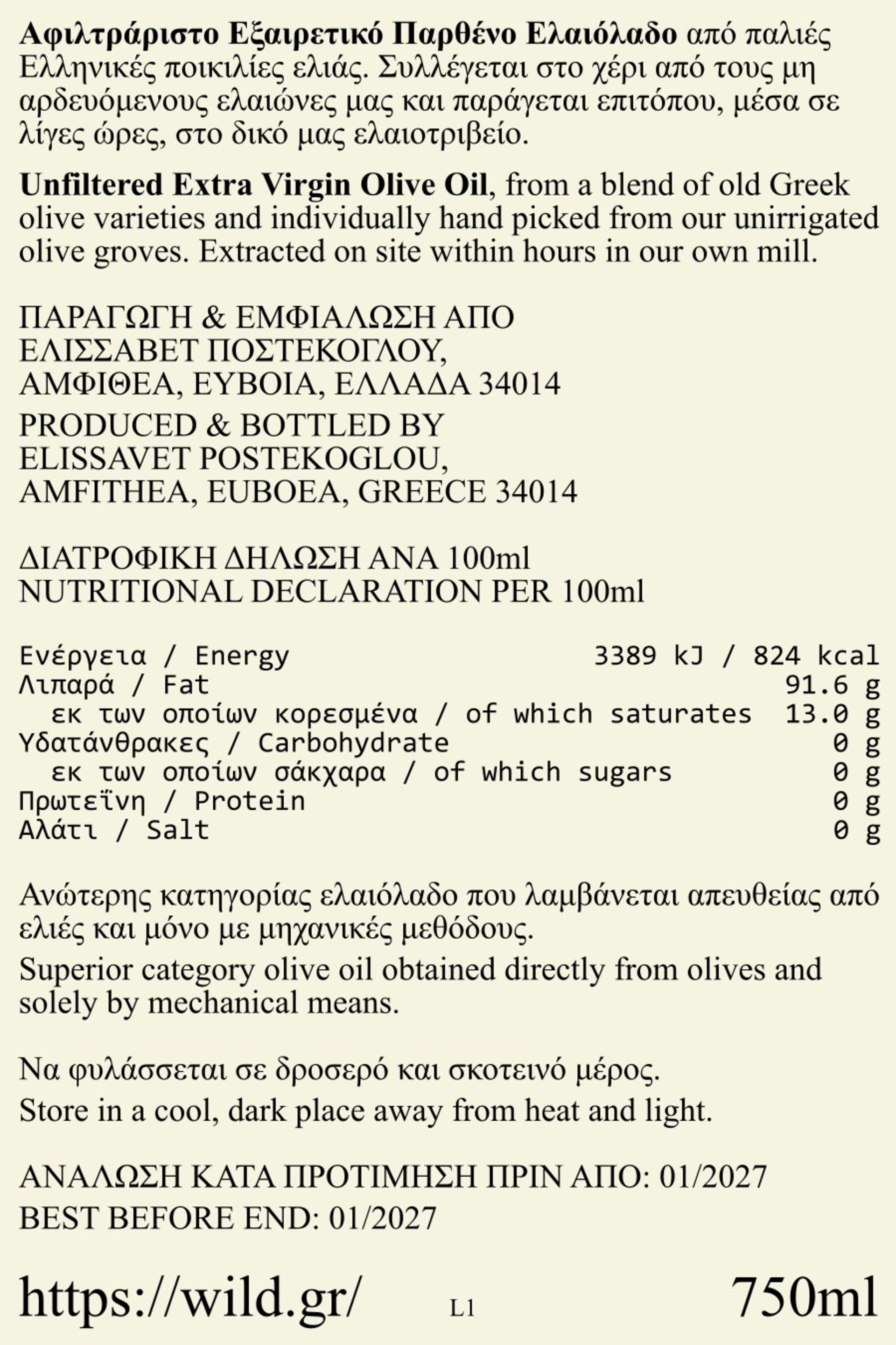 Unfiltered Extra Virgin Olive Oil, from a blend of old Greek olive varieties and individually hand picked from our unirrigated olive groves. Extracted on site within hours in our own mill.