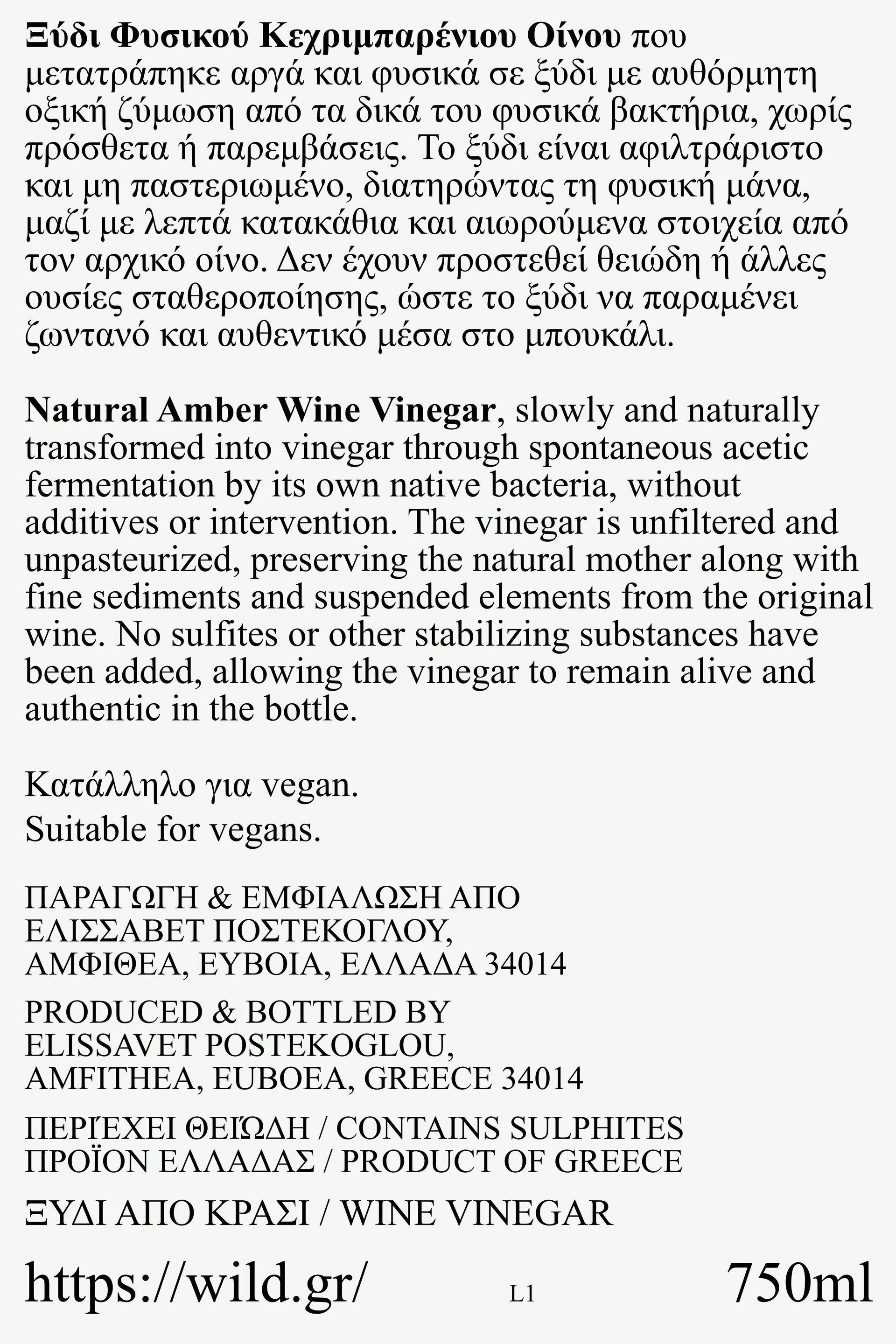 Natural Amber Wine Vinegar, slowly and naturally transformed into vinegar through spontaneous acetic fermentation by its own native bacteria, without inoculation, additives or intervention.
