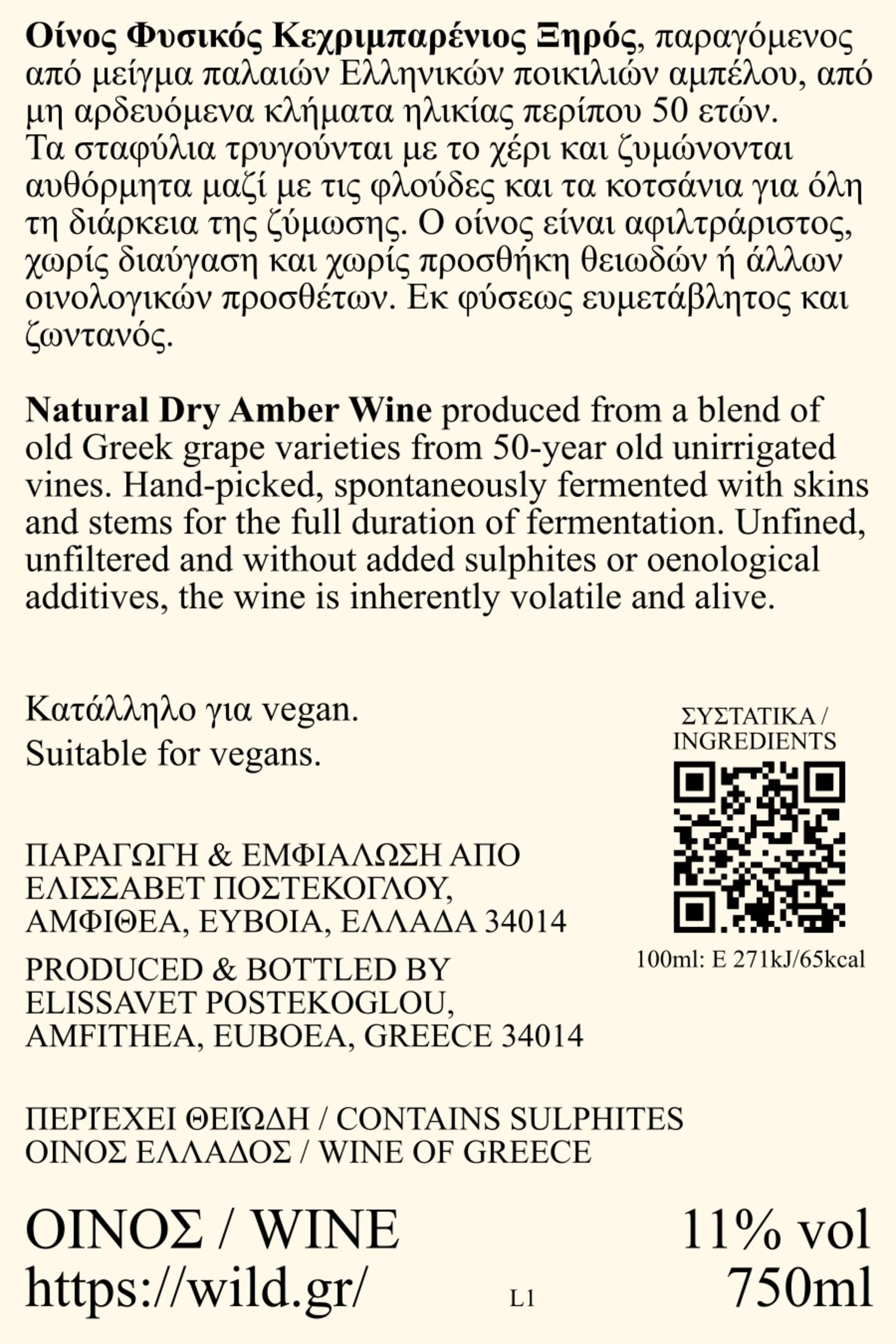 Natural Dry Amber Wine produced from a blend of old Greek grape varieties from 50-year old unirrigated vines. Hand-picked, spontaneously fermented with skins and stems for the full duration of fermentation. The wine is unfined, unfiltered and without added sulphites or oenological additives.